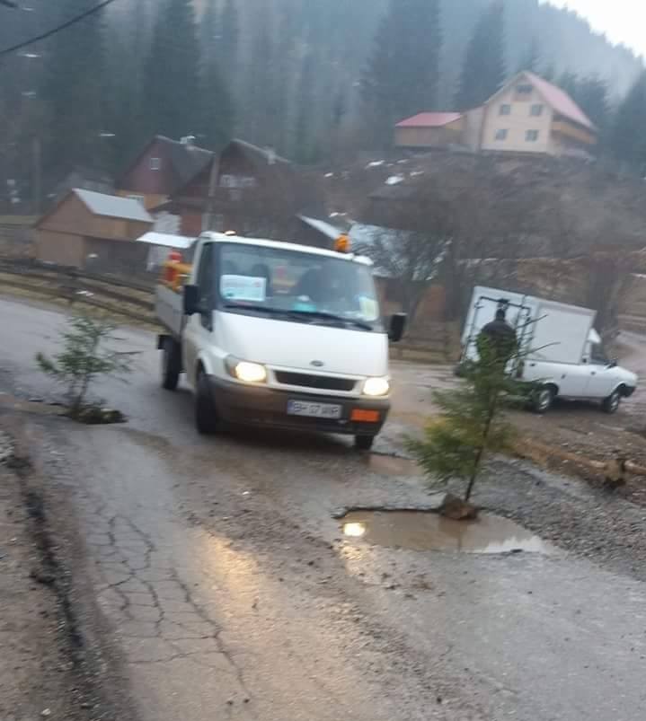 Astfel, oamenii au plantat brazi in craterele imense din asfalt si cu siguranta "noile indicatoare" vor atrage atentia asupra starii drumului si poate asa va fi reparat mai curand.