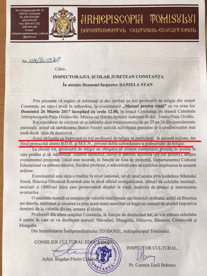 Arhiepiscopia Tomisului cere imperativ, printr-o adresa trimisa Inspectoratului scolar Judetean Constanta, ca profesorii de Religie sa participe la „Marsul pentru viata”. Potrivit adresei, Arhiepiscopia sustine ca Inspectoratul are obligatia sa ia parte la acest eveniment, iar elevii trebuie sa fie informati despre acesta.