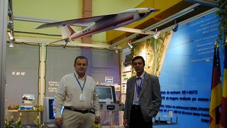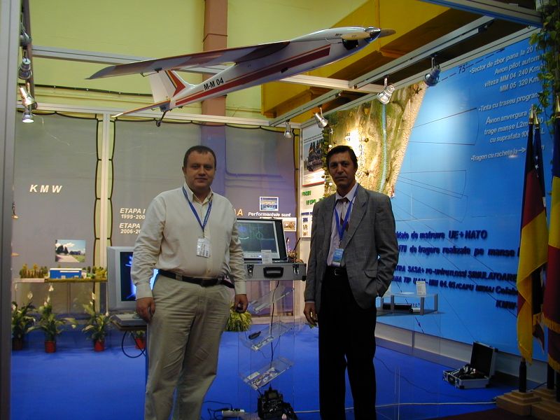 12 din 14 | Emanuel Pop (stânga) și Ionel Mîndru (dreapta), cu avionul țintă Quarrus la Expomil în 2005