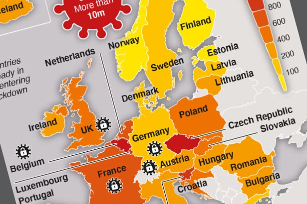 Europa a depășit de mult timp alte continente în privința impactului pe care îl are pandemia, atât ca număr de infectări, cât și ca decese. Cele 52 de ţări din regiune constituie zona cea mai afectată din lume în ceea ce priveşte numărul de cazuri, înaintea Americii Latine şi Caraibelor (11,5 milioane de cazuri) şi a Asiei (10,9 milioane).