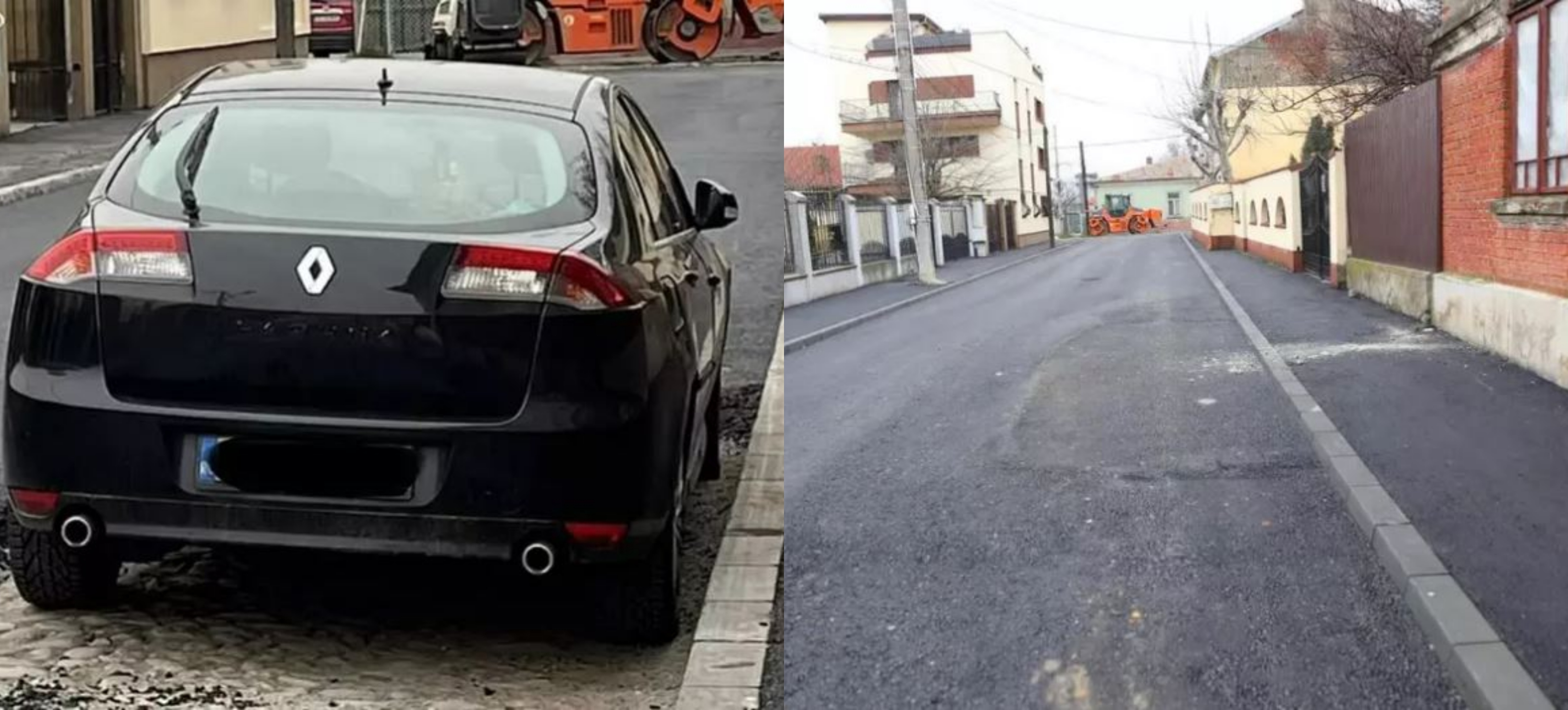 O imagine de pe o stradă din Craiova a devenit virală. Lucrătorii au asfaltat șoseaua, cu excepția unui loc de parcare pentru că nu au putut muta mașina.