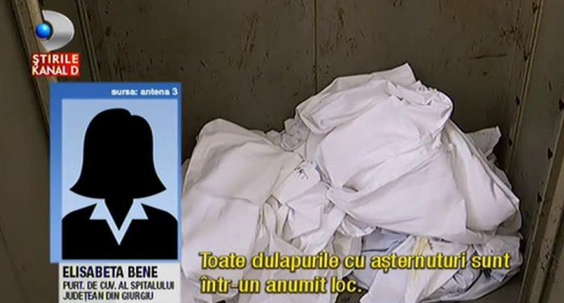 Dulapuri cu haine şi aşternuturi pline de sânge şi jeg, grupuri sanitare inundate de mizerie, haite de câini care se plimbă în voie. Nu vorbim despre vreo clădire dezafectată sau de o groapă de gunoi, ci despre ditamai spitalul judeţean, în care oamenii vin să-şi caute sănătatea!. Colegii nostri, Larisa Hogea şi Cristi Emac, au suprins imagini înfiorătoare, la Giurgiu şi au descoperit motivul incredibil pentru care această unitate, în fapt o bombă ecologică, este ferită de amenzi!. ##VIDEO25388##
