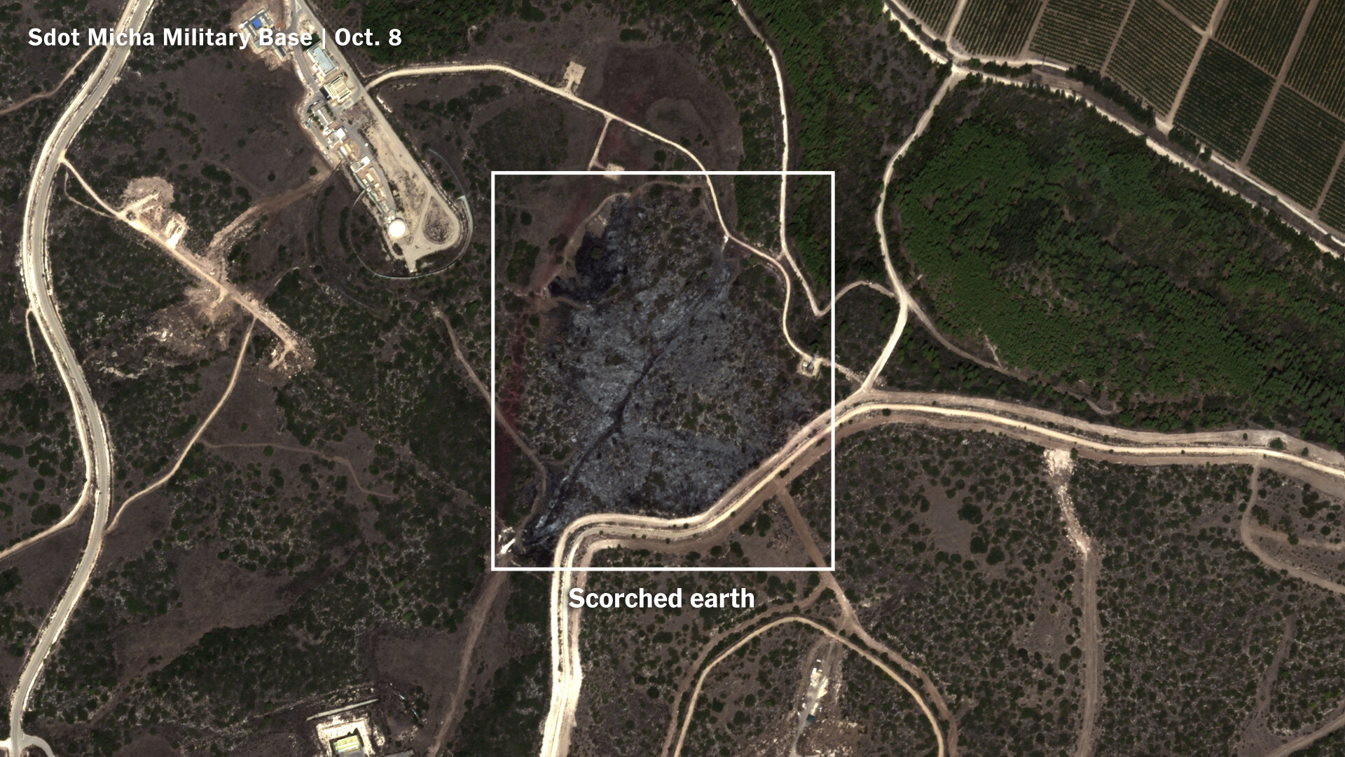 Analizând imaginile din satelit, raportul spune că o rachetă a lovit în vecinătatea bazei aeriene Sdot Micha, lângă Beit Shemesh, în dimineața zilei de 7 octombrie, în timp ce Hamas a tras mii de rachete asupra Israelului în timpul atacului său din sud.