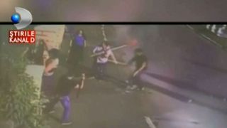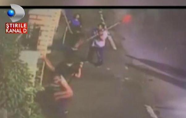 Camera de supraveghere surprinde asaltul. Primul care da cu piatra este acest tanar. Ia un par de pe jos, apoi arunca un bolovan spre poarta rivalilor. Pleaca nervos, insa abia de-acum inainte se-ncing spiritele.