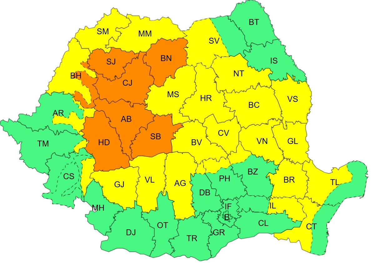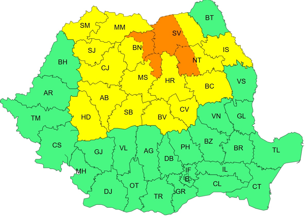„În zona de munte a județelor Suceava, Neamț, Bistrița-Năsăud și Mureș vor fi averse importante cantitativ, frecvente descărcări electrice și intensificări ale vântului. În intervale scurte de timp sau prin acumulare, cantitățile de apă vor fi de 40...50 l/mp și izolat de peste 60 l/mp”, notează ANM.