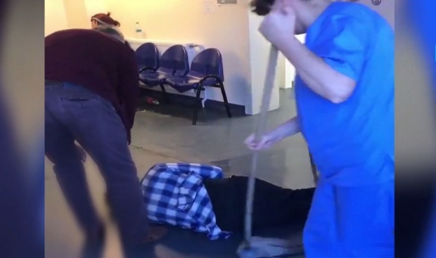 Mai mult, o femeie de serviciu spala nepasatoare podeaua, fara a acorda cea mai mica atentie barbatului intins pe jos la doar cativa centimetri fata de ea.