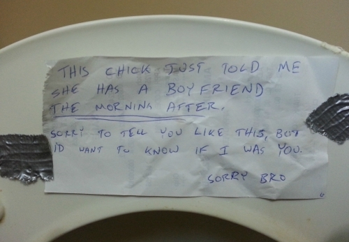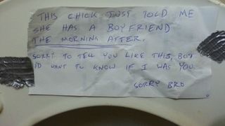 "Tipa asta mi-a spus azi dimineata, dupa ce azi-noapte am facut amor, ca are iubit. Imi pare rau ca afli in felul asta, dar, daca as fi fost in locul tau, as fi vrut sa aflu", a scris baiatul pe biletel.