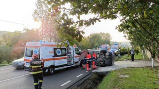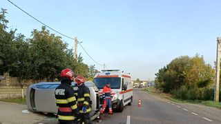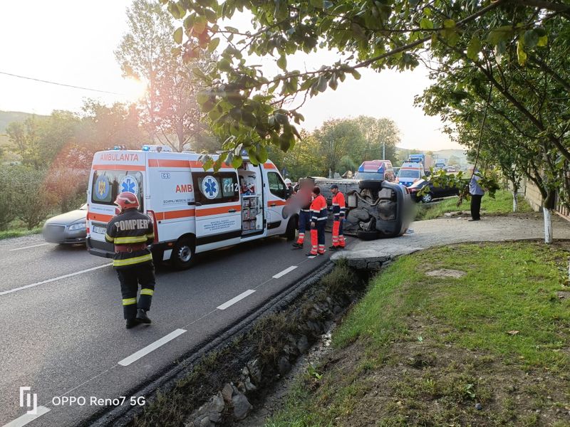 3 din 4 | Autoturism răsturnat pe șoseaua din comuna Bunești, județul Suceava. Trei persoane au fost duse la spital