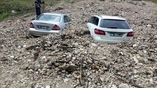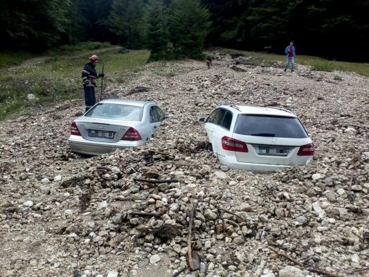 Potrivit informatiilor furnizate de catre reprezentantii Inspectoratului pentru Situatii de Urgenta Brasov, duminica seara, doua autoturisme au fost ingropate in proportie de 80 la suta de o viitura produsa in urma ploii abundente si care a antrenat cantitati mari de pietris, in zona Fantanii lui Botorog, din localitatea brasoveana Zarnesti.