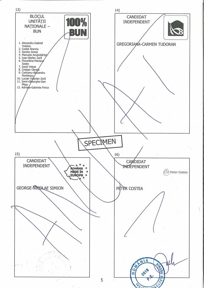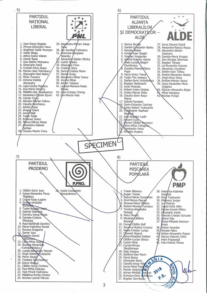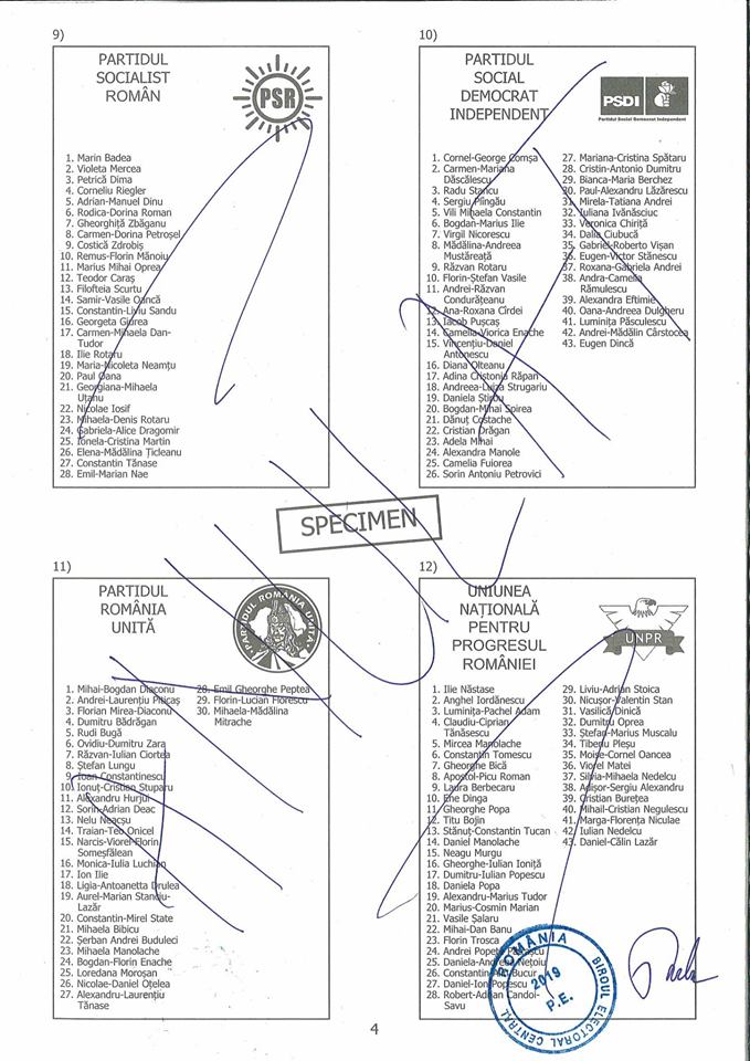 Pentru alegerile europarlamentar, modelul buletinului de vot a fost publicat pe pagina oficială a Autorității Electorale Permanente, are în total opt pagini, în care se află căsuțe cu partidele și numele candidaților propuși de acestea. La final, sunt căsuțe și pentru cei trei candidați independenți care își doresc să ajungă în Parlamentul European. Ștampila cu ”votat” trebuie pusă în interiorul unei căsuțe, ștampilarea mai multor căsuțe sau în afara lor, atrage anularea votului.