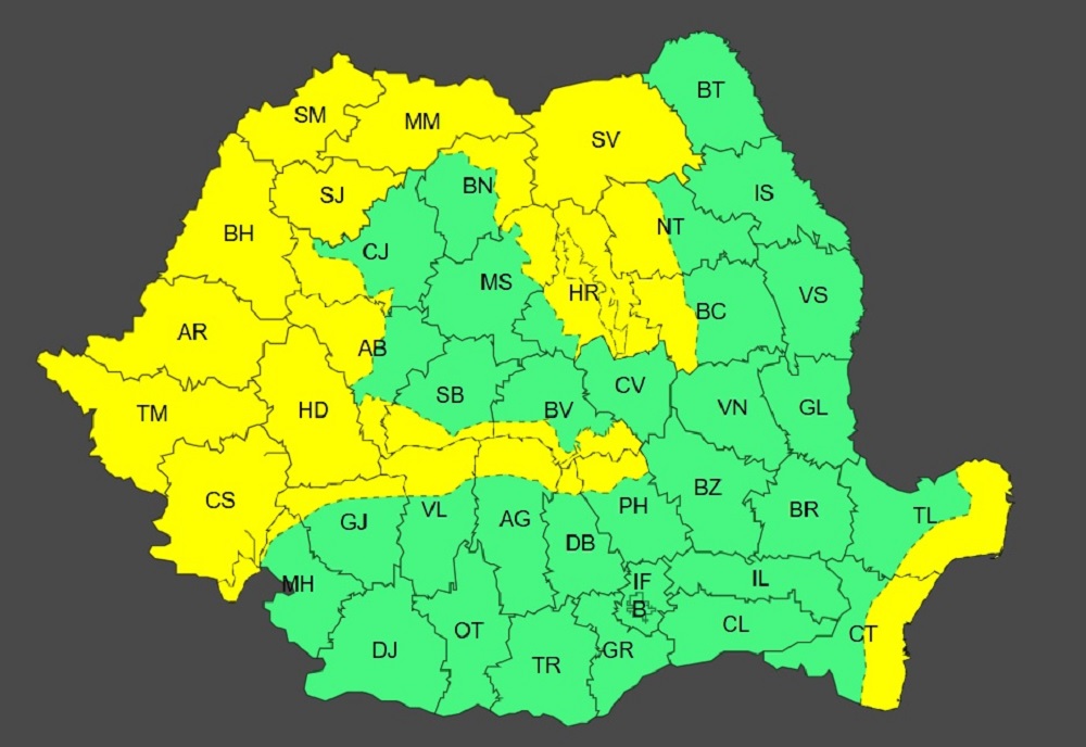 Rafalele de vânt vor ajunge la 55-60 de kilometri la oră în zonele joase şi vor depăşi 70 de kilometri la munte. În Banat, Crişana, Maramureş, local în Transilvania, în nord-vestul Moldovei şi pe litoral este cod galben.