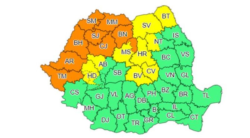 De asemenea, în intervalul 29 iunie, ora 19:00 – 30 iunie, ora 10:00, va fi cod portocaliu în judeţele Satu Mare, Maramureş, Sălaj, Cluj, Bistriţa Năsăud şi în zona de munte a judeţului Mureş.