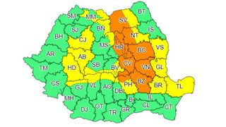 Aceştia anunţă cod portocaliu, luni, între orele 14.00 şi 19.00, în judeţele Bacău, Vrancea, Buzău, Covasna şi în zona montană a judeţelor Prahova, Braşov, Harghita, Neamţ şi Suceava.