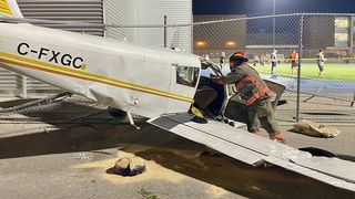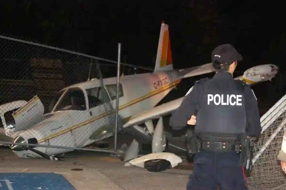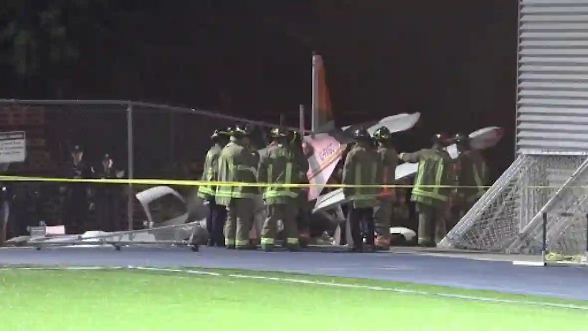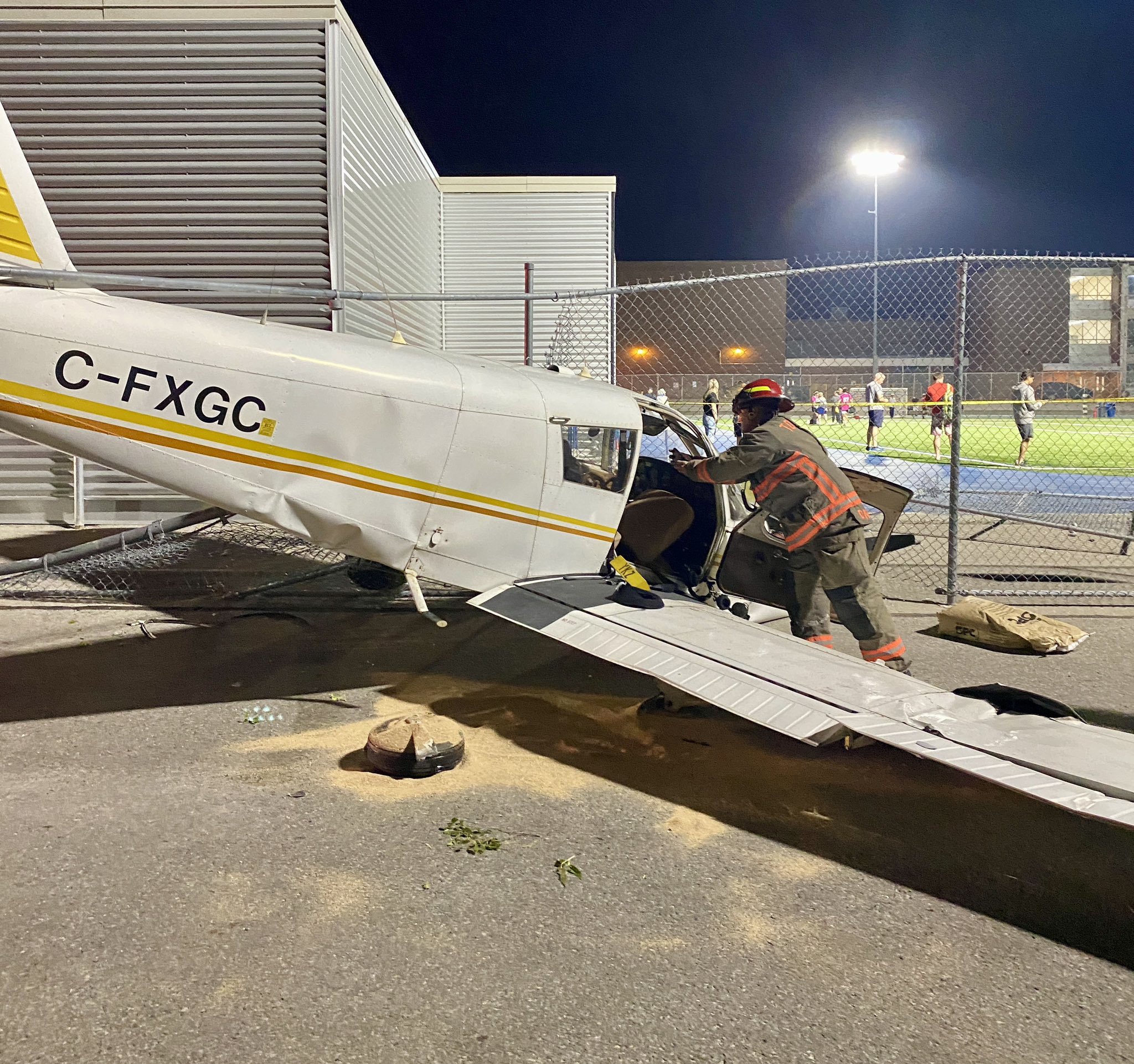Pompierii au fost chemați la fața locului luni seara după ora 20:15. Când echipajele au sosit, au constatat că avionul se izbise de un gard într-o parcare de lângă o tribună laterală a terenului de fotbal.
