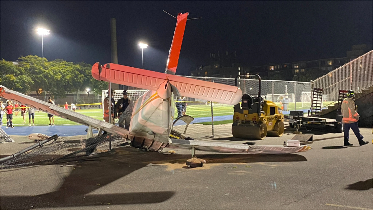 ✈️ A small plane's engine failed mid-flight, forcing an emergency landing on a Toronto high school football field yesterday. The Piper Cherokee clipped a fence just 50ft from players.. no injuries to the 3 aboard or athletes! Plane's wrecked, but everyone's safe. Close call! pic.twitter.com/kriXYN0CNd