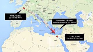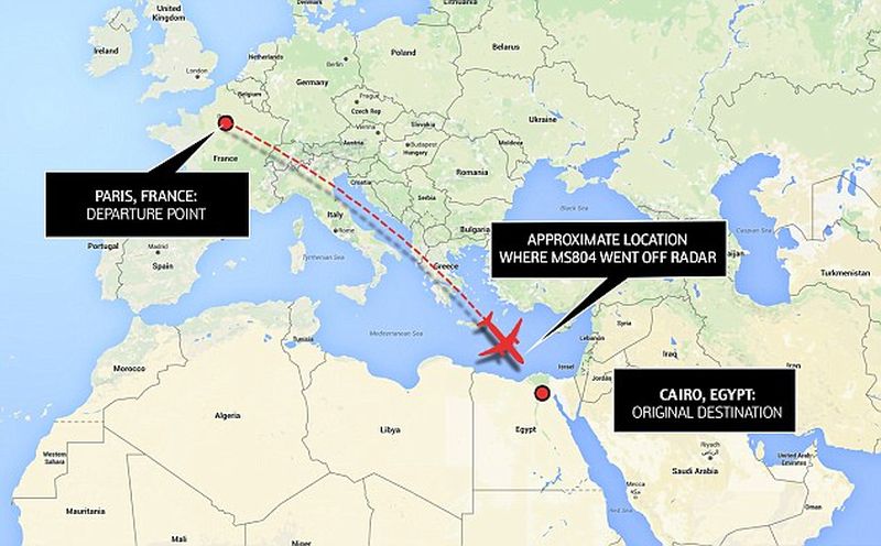 Comandatul unei nave comerciale din Marea Mediterana a declarat ca a vazut "flacari pe cer". Un oficial din cadrul companiei EgyptAir a declarat ca echipajele de cautare ale forţelor armate egiptene au inregistrat un SOS transmis de echipamentele de urgenta la ora 4.26,