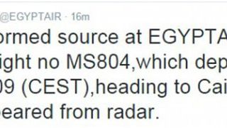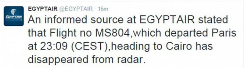 „O sursă informata a EgyptAir a declarat ca zborul nr. MS804, care a decolat de la Paris la 23.09 (Ora de vara a Europei Centrale), ondreptandu-se spre Cairo, a disparut de pe radar.”