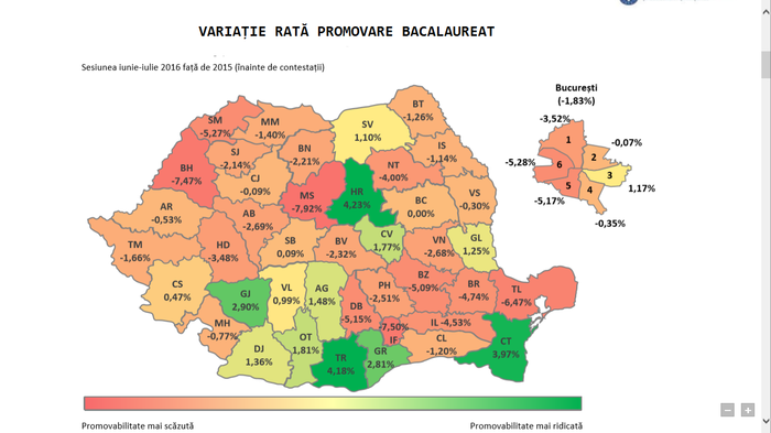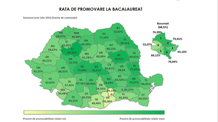 Rata de promovare înregistrata de absolventii care au sustinut probele în prima sesiune a examenului national de Bacalaureat 2016 este de 66,7%, ia rcel mai inalt nivel de promovabilitate s-a inregistrat in judeţele Cluj (83,32%), Bacău (79,91%), Braşov (78,21%) Sibiu (77,69%) şi Galaţi (77,65%).