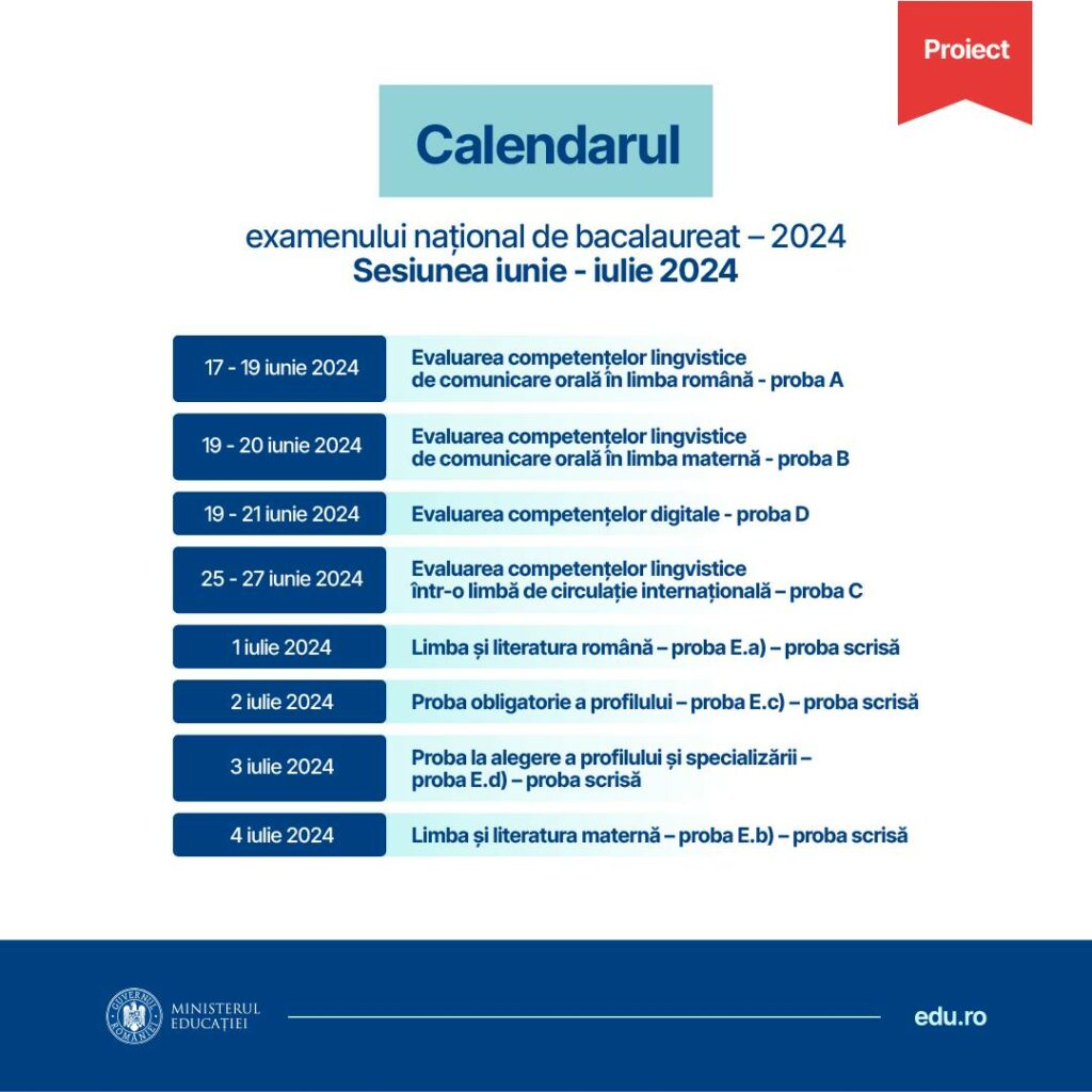 Ținând cont că nu au fost anunțate datele exacte ale examenelor, Bacalaureatul 2024 ar putea arăta după următoarea formă, potrivit datelor din proiectul Ministerului Educației.