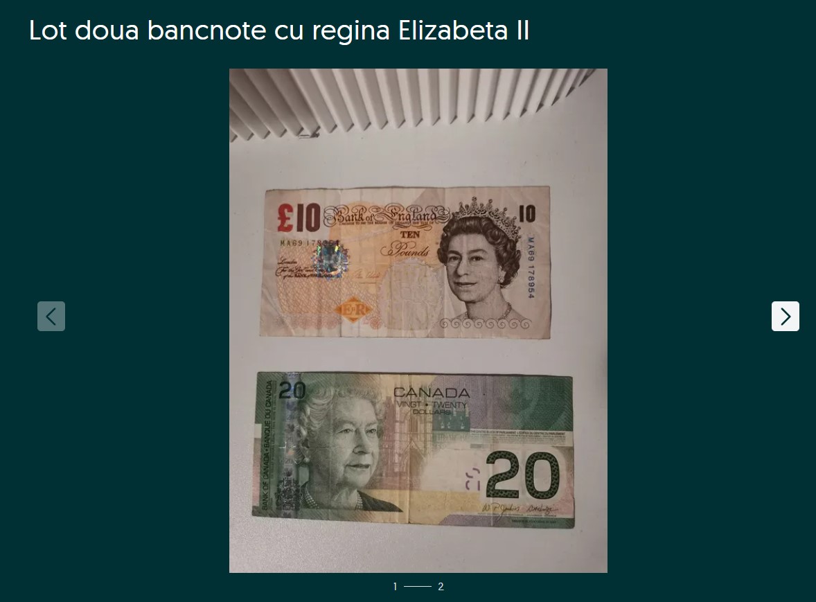 „Ofer spre vânzare doua bancnote cu regina Elisabeta a II-a Marii Britanii. Una de 10 lire sterline (Darwin) și una de 20 de dolari canadieni din anul 2004. Trimit în țara cu livrare prin Olx, Fan curier sau Poșta Română. Pentru orice detalii suplimentare vă rog să nu ezitați să mă contactați”, a menționat românul în descrierea articolelor sale.