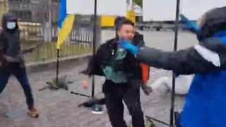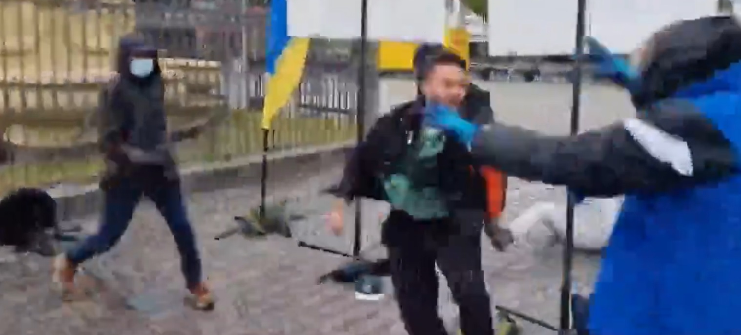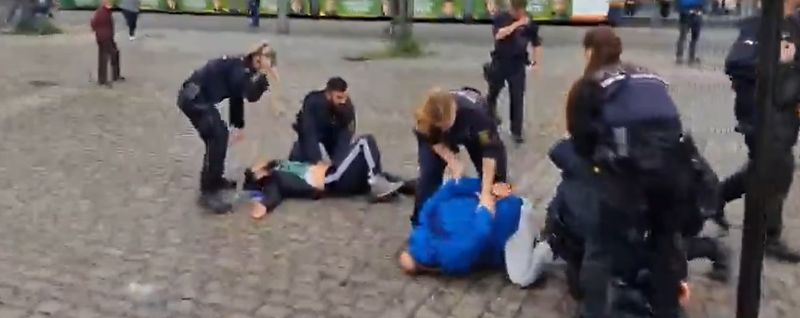 Într-un videoclip postat pe rețelele sociale se vede cum atacatorul se luptă, la pământ, cu un alt bărbat, care încearcă să îi smulgă cuțitul din mână.