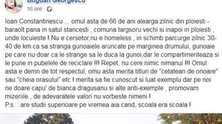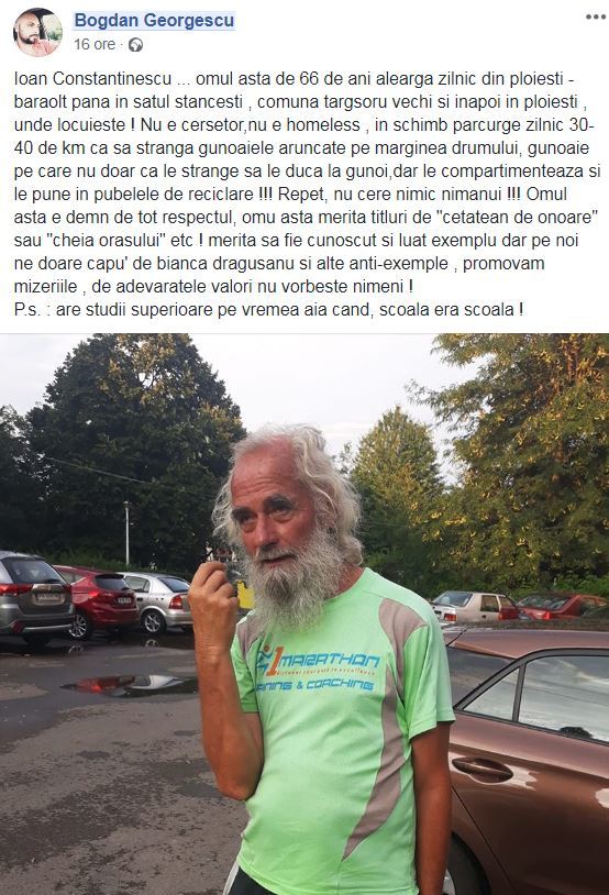 “Ioan Constantinescu... omul asta de 66 de ani alearga zilnic din Ploiesti- Baraolt pana in satul Stancesti, comuna Targsoru Vechi si inapoi in Ploiesti, unde locuieste!! Nu e cersetor, nu e homeless, in schimb parcurge zilnic 30-40 de km ca sa stranga gunoaiele aruncate pe