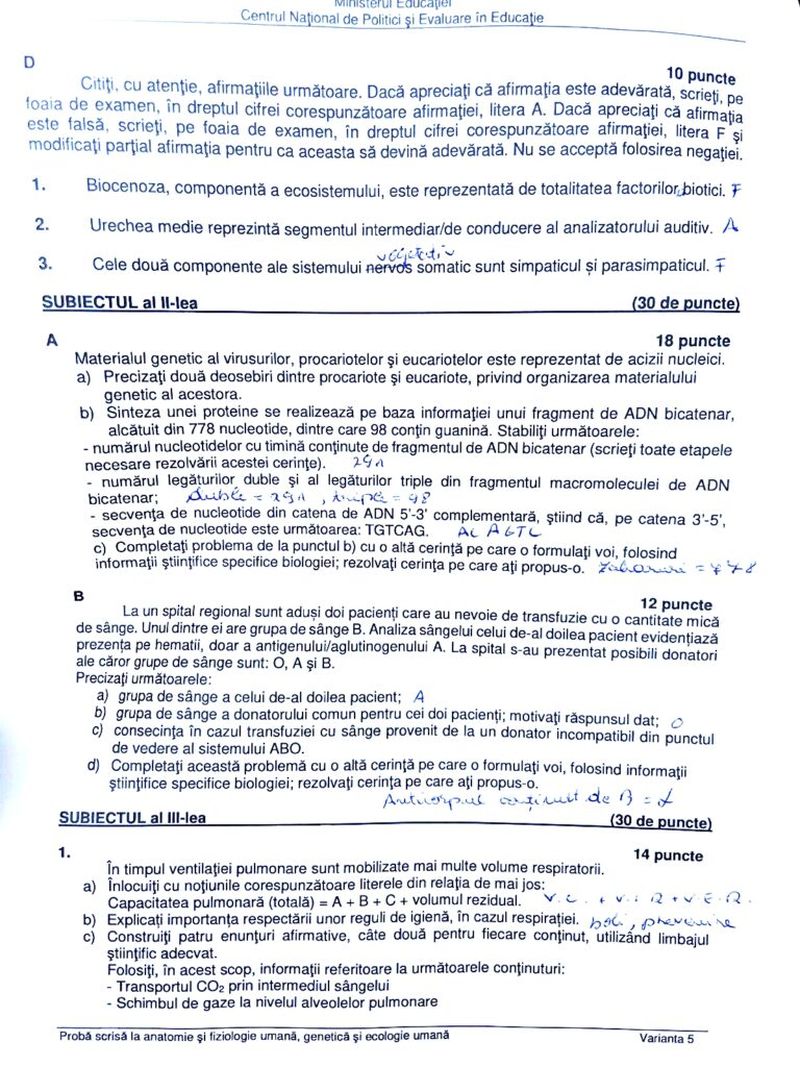 UPDATE: Subiectele picate la Anatomie și Fiziologie umană