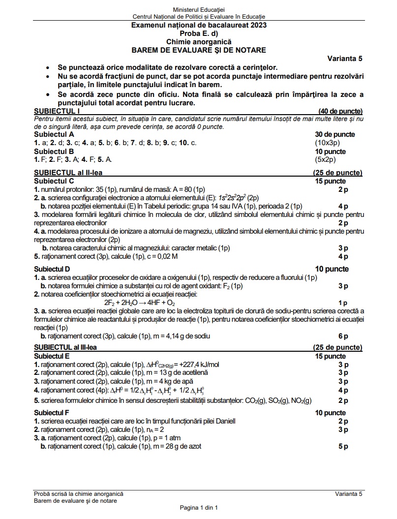 Barem Chimie BAC 2023 Edu.ro. Miercuri, 28 iunie, elevii claselor a XII-a au susținut cea de-a treia probă din cadrul examenului de Bacalaureat.