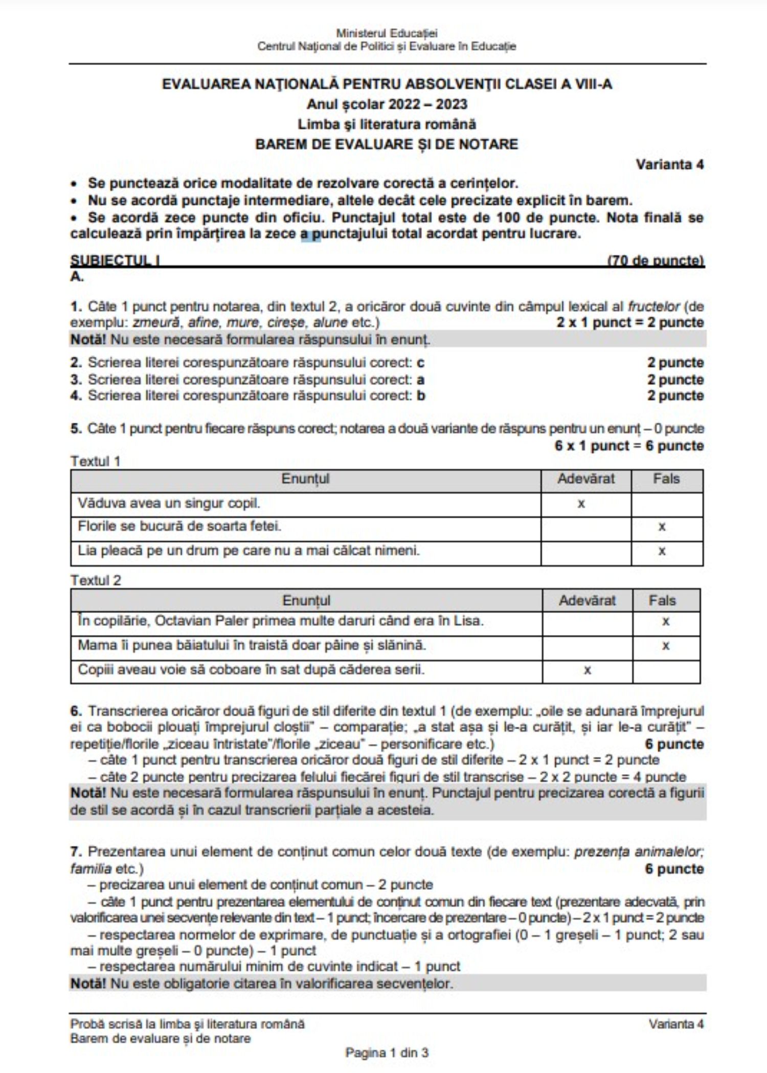 1 din 4 | Barem Evaluare Națională 2023 Română. Cum se rezolvă corect subiectele?