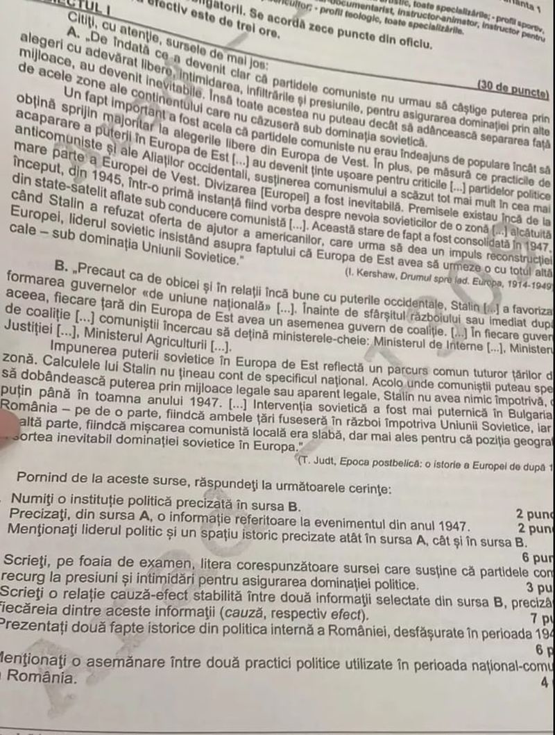 La primul subiect de la proba la Istorie, elevii au primit două texte de T. Judt, din „Epoca postbelică: o istorie a Europei de după 1945” și de I.