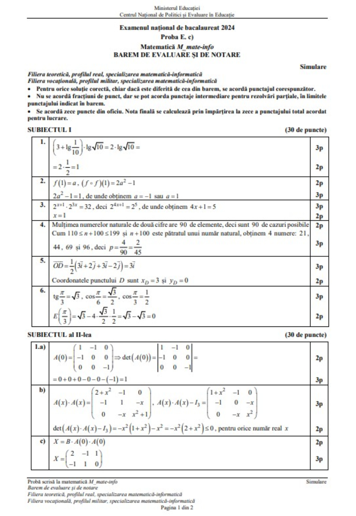 Puteți vedea baremul de corectare la Matematică pentru simulare BAC 2024.