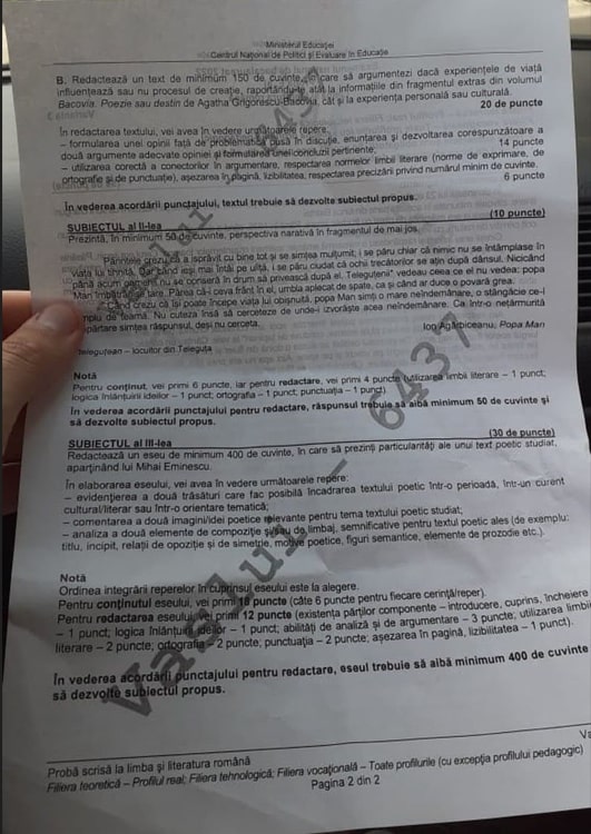 La subiectul al III-lea, elevii au avut de realizat un eseu de minimum 400 de cuvinte în care să prezinte particularitățile unui text poetic studiat, care aparține marelui poet Mihai Eminescu.