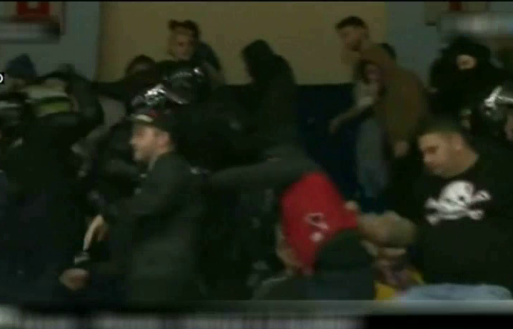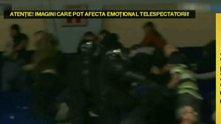 Unul dintre spectatori este intr-o situatie disperata. A fost prins cu copilul in mijlocul scandalului. Priviti-l cu atentie pe barbatul care isi ridica baietelul peste balustrada tribunei incercand sa-l scoata mai repede din zona periculoasa.