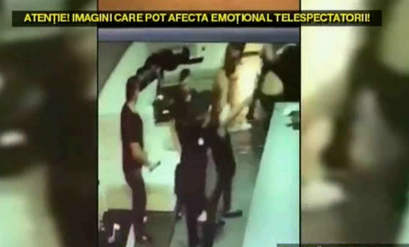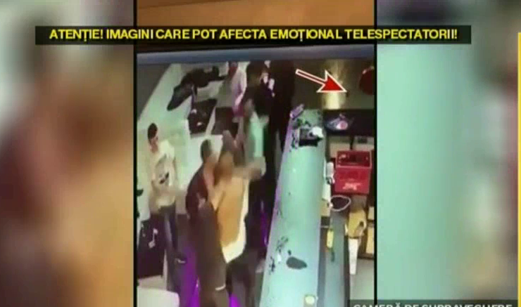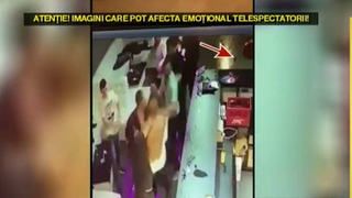Acelasi barbat este lovit cu pumnii si cu sticlele chiar daca a cazut la pamant, in holul discotecii. Totul se intampla sub ochii paznicului de la intrare, care n-are nicio reactie.