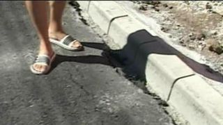 Priviti cum se crapa asfaltul sub rotile masinii de gunoi. Lucrarea de mantuiala se sfarama de parca ar fi facuta din nisip, nu din ciment.