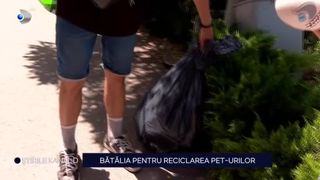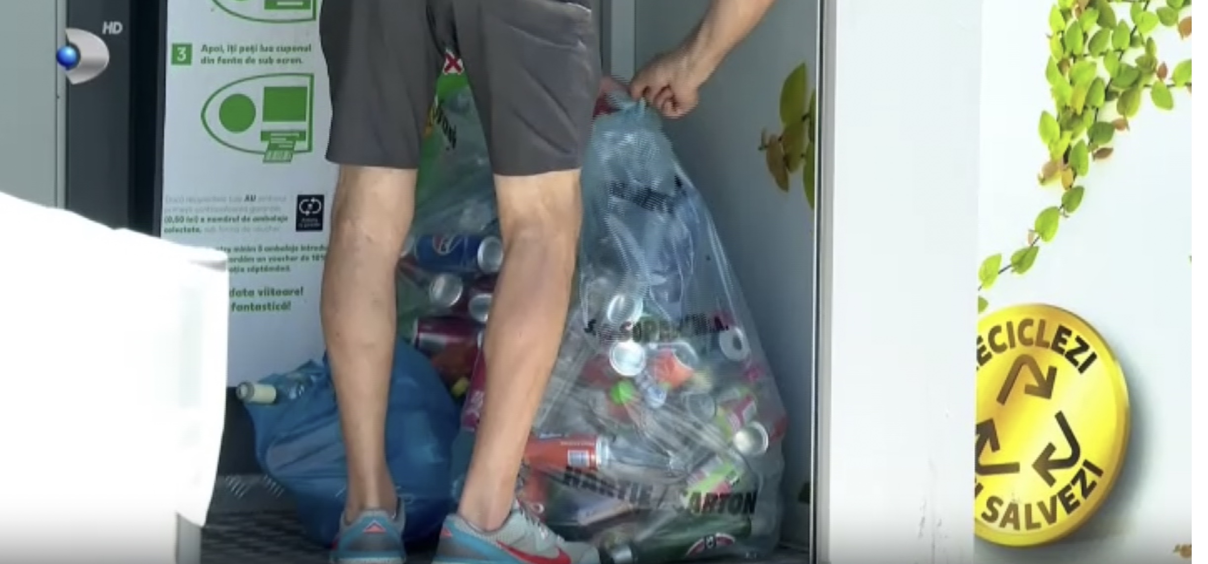 În parcarea unui supermarket, mai mulți oameni scot dintr-o mașină un sac plin ochi cu pet-uri și alte două pungi. Lor li se mai adaugă și reciclatorii profesioniști sau, altfel spus, căutătorii de pet-uri, acele persoane care adună de peste tot ambalajele reciclabile, cum este și cazul acestui tânăr, pentru a avea o sursă suplimentară de venit.