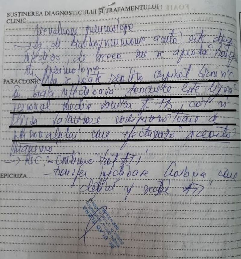 Medicul Elena Vlad a venit şi consultat-o pe pacientă, după care a scris în fişa acesteia că nu se poate realiza aspirarea bronşică din cauza „lipsei personalului mediu şi lipsă salarizare corespunzătoare“