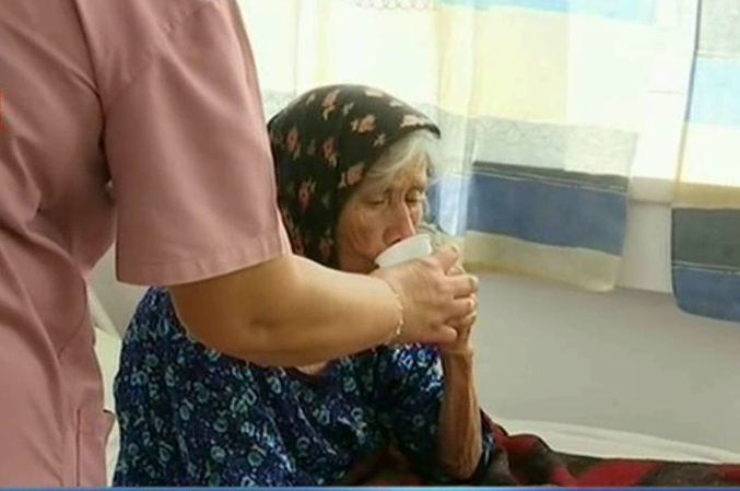 Aproape oarba si surda, batrana saruta mainile celor care o ingrijesc. In gestul simplu e toata multumirea ei de om singur pe lume.
