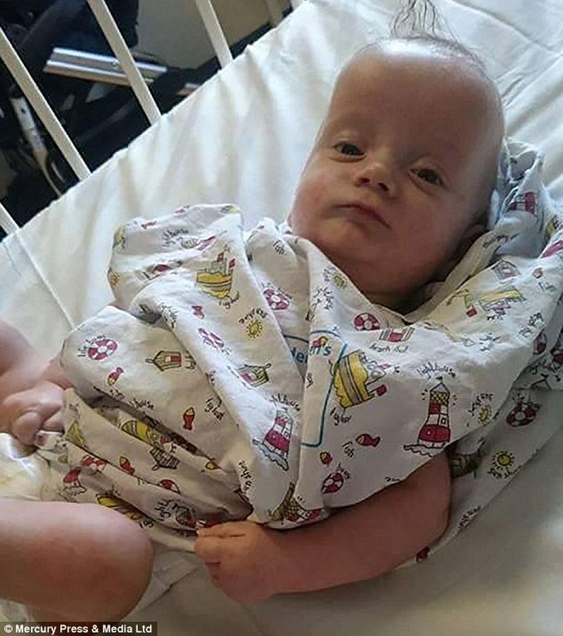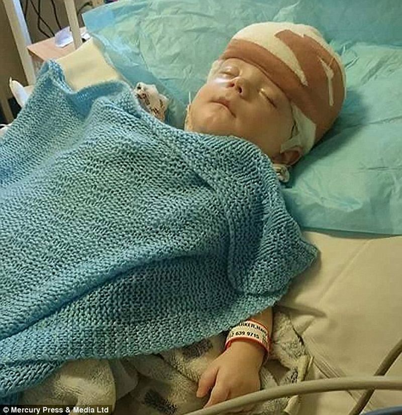 Bebelusul care s-a nascut cu un cap supradimensionat din cauza unei afectiuni arata acum normal, dupa ce a suferit doua interventii chirurgicale. El a fost orb cate zile, ca efect al operatiilor.