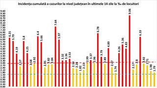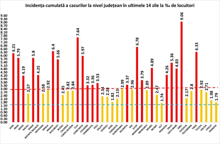 Rata de incidență este cea mai mare în județele Sibiu- 9,02 cazuri la mia de locuitor, Cluj- 7,64 și Ilfov- 6,78. În Capitală, indicele de infectare este de 5,66 la mie.