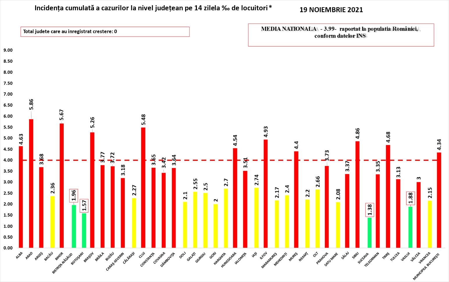 În patru județe- Bistrița, Botoșani, Suceava și Vaslui- indicele COVID-19 este sub 2, fiind în zona verde. 14 județe sunt în zona galbenă având o incidență peste 2, dar nu mai mare de 3. În București, rata de infectare este de 4,34.