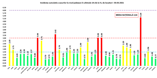 Grupul de Comunicare Strategică a anunţat miercuri 4,278 de cazuri noi de COVID-19 și 77 de decese înregistrate în ultimele 24 de ore. La ATI sunt 1.032 de pacienţi cu COVID-19, iar numărul judeţelor în care coeficientul infectărilor cumulate a trecut de 3 a ajuns la cinci după ce Braşovul a înregistrat o valoare de 3,04 a acestui indicator.