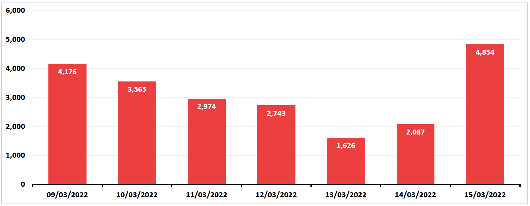 Anteriorul vârf de infectări a fost atins în urmă cu o săptămână, pe data de 8 martie, când s-au raportat 5400 de noi îmbolnăviri la nivel național.