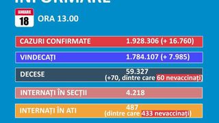 Bilanț coronavirus, marți 18 ianuarie. De asemenea, au fost raportate 70 decese, dintre care 5 anterioare. Cifra este mult mai mare decât cea din bilanțul de luni, când erau doar 17 decese. Datele integrale au fost prezentate detaliat în buletinul informativ de la ora 13.00.
