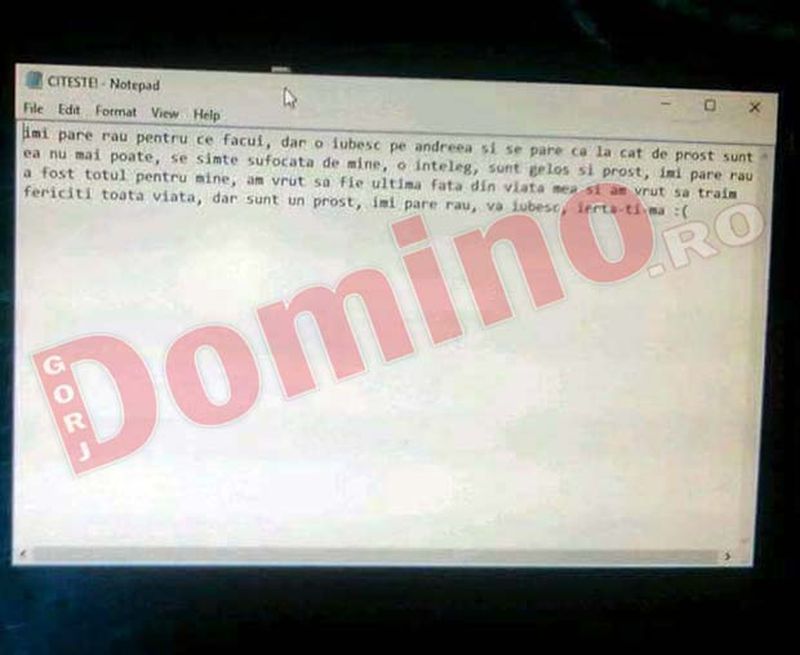 1 din 2 | Biletul de adio lasat de tanarul de 17 ani din Gorj care s-a sinucis dupa ce s-a certat cu iubita. "Am vrut sa fie ultima fata din viata mea. Sunt un prost!"
