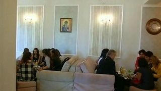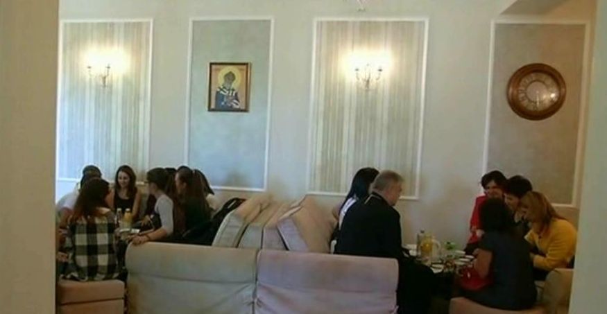 Localul n-are nimic de-a face cu cele pline pana la refuz de tineri: in locul sticlelor de-alcool, sunt biblii si icoane, iar pe pereti nu sunt tablouri cu vedete, ci cu duhovnicul Arsenie Boca.