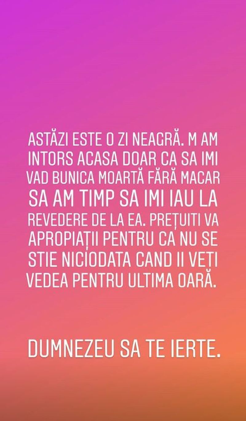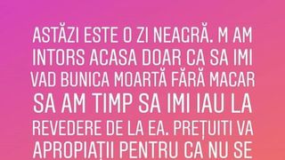"Astăzi este o zi neagră. M-am întors acasă doar ca să îmi văd bunica moartă fără măcar să am timp să îmi iau la revedere de la ea. Prețuiți-vă apropiații pentru că nu se știe niciodată când îi veți vedea pentru ultima oară. Dumnezeu să te ierte", este mesajul publicat de Mocanu pe contul personal de Instagram.