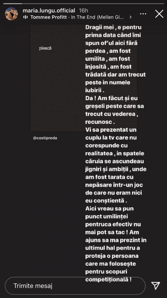 În urmă cu doar o săptămână și jumătate, extrem de supărată și revoltată, Maria Lungu le-a povestit fanilor săi de pe Instagram prin câte a trecut de-a lungul relației sale cu Marinescu. Aceasta consideră că a fost umilită, jignită, înjosită și că Marinescu ar fi stat din interes competițional cu aceasta, nu din pură iubire.