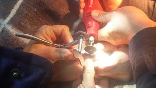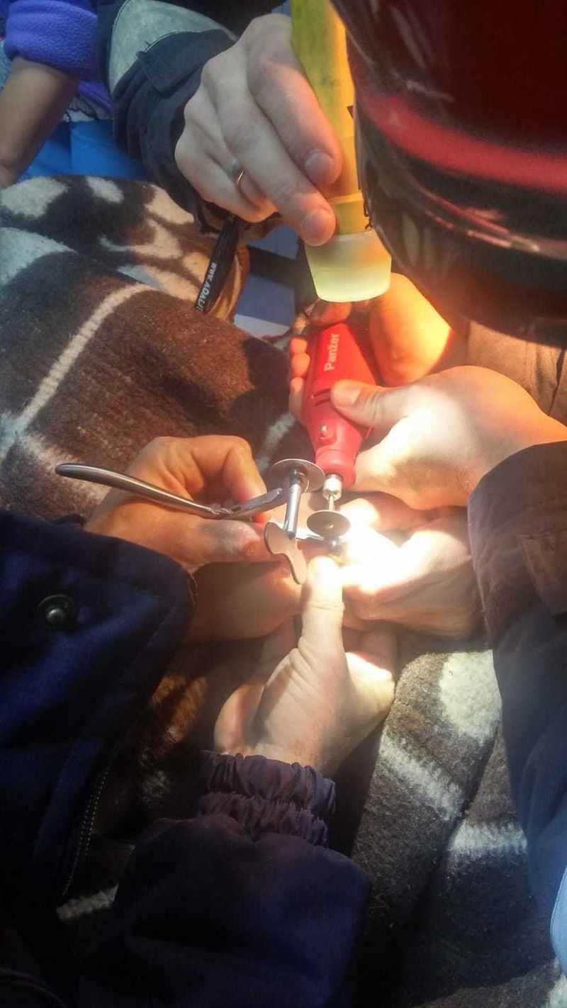 "Am folosit un dispozitiv de tăiat, iar sub inel am pus o ustensilă chirurgicală. Tăiam o singură dată şi ne opream să răcim metalul cu apă, pentru că se înfierbânta foarte tare. După jumătate de ora am reuşit sa înlăturăm inelul. Am ţinut degetele noastre lângă inel să ne asiguram că nu ii agravăm trauma.