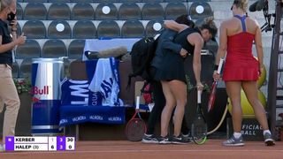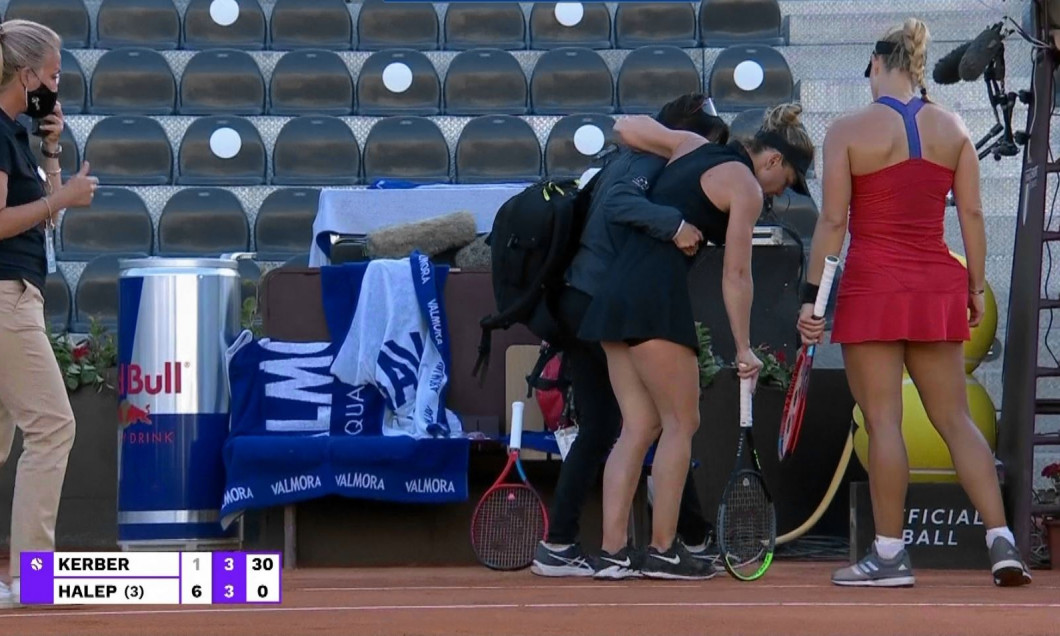 Halep a părăsit complexul în lacrimi, fiind ajutată de mai multe persoane. Angelique Kerber a stat permanent lângă jucătoarea noastră, a vorbit cu ea, i-a adus un scaun, iar la final i-a cărat geanta.